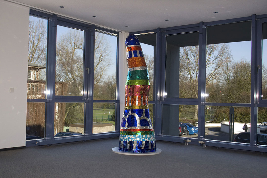 Der überlebensgroße „Obelisque aux étoiles“ ist mit miniaturhaften teils eingefärbten, emaillierten Spiegelchen versehen, die als scherbenartige Mosaiksteinchen die zylindrische, sich nach oben verjüngende Plastik ganzförmig überziehen.